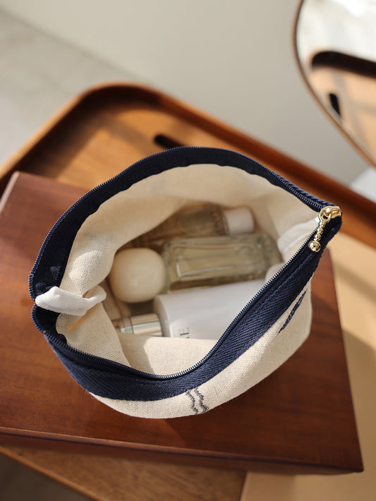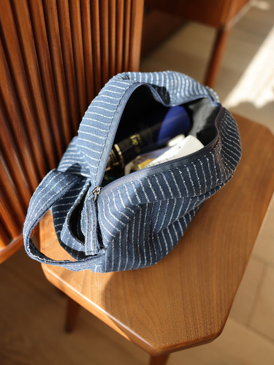 Classic Striped Large Capacity Handheld Makeup Bag, Dark Zipper Skincare Travel Portable Storage Pouch, Inner Liner Organizer